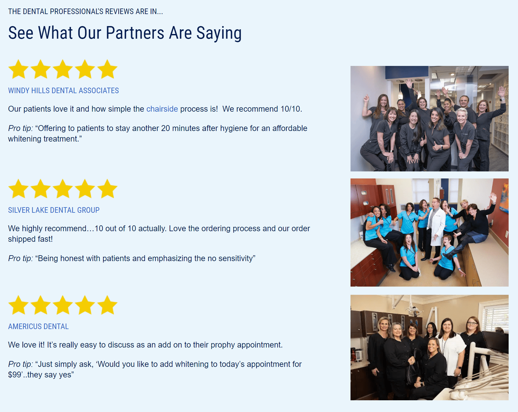 "We had Sinsational Smile and switched to Smile Perfected. I'm glad we did. Because my patients and office team like the product and customer service!"